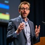 A man in a suit and glasses speaks animatedly at a podium with a microphone, resembling an expert presenting critical data. In the background, a screen displays graphs, providing visual support to his narrative. A small author box at the corner highlights his credentials.